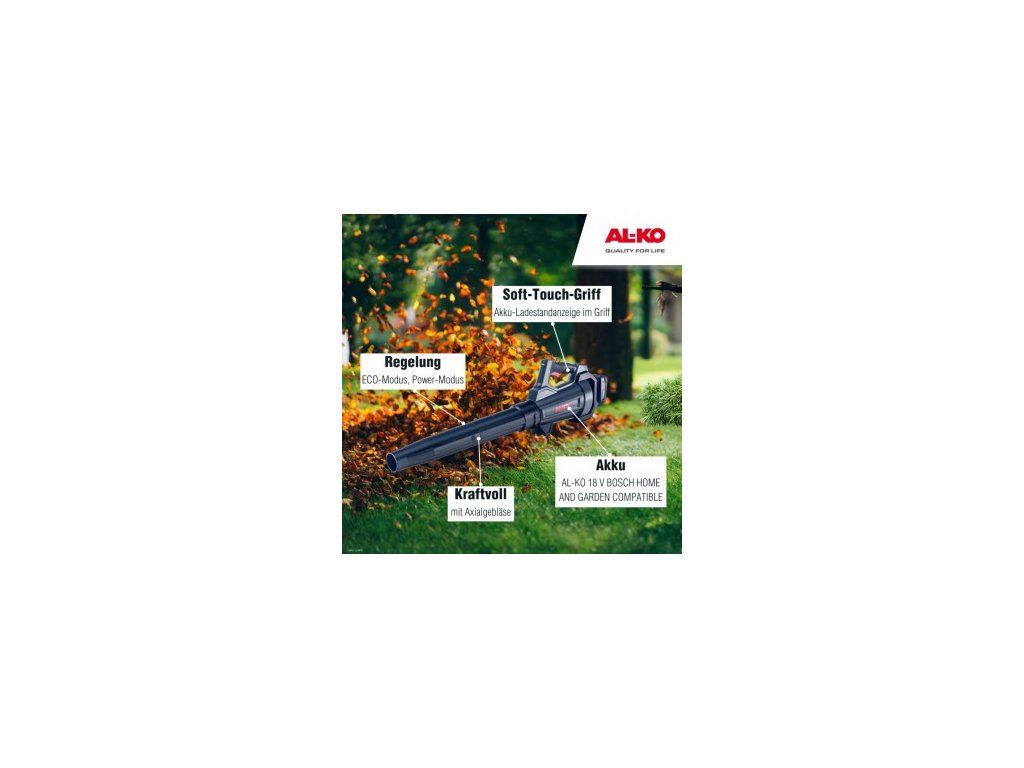 Akumulátorový fúkač lístia AL-KO LB 1860 - 18 V BOSCH HOME AND GARDEN COMPATIBLE Akumulátorový fúkač na lístie LB 1860 vám ponúka bezdrôtové, beznámahové a ekologické záhradnícke potešenie. Ľahké a praktické zariadenie umožňuje flexibilnú prácu bez ťažkopádneho napájacieho kábla, bez benzínu, a teda bez výfukových plynov. Vďaka prídavnej funkcii boost pre vyšší výkon môžete bez námahy odstraňovať suché lístie z rovných povrchov. Technické údaje akumulátorového fukára na lístie AL-KO LB 1860 Akumulátorový fúkač lístia AL-KO LB 1860 pracuje s rýchlosťou vzduchu až 165 km/h. Môžete si vybrať medzi úsporným režimom pre prácu šetriacu batériu a režimom Power pre extra výkon. Fúkač na lístie vám okrem iného ponúka vysokú úroveň komfortu vďaka pohodlnej rukoväti s mäkkým povrchom a praktickému zaveseniu na zadnej strane. Vďaka hmotnosti len 1,8 kg (bez batérie) je zaručená práca bez únavy. Výkonný axiálny ventilátor zaznamenáva objemový prietok 450 m³/h. S akumulátorom AL-KO 18 V BOSCH HOME AND GARDEN COMPATIBLE Li-Ion máte k dispozícii rôzne časy chodu a nabíjania, pretože si môžete vybrať zo štyroch rôznych veľkostí Ah. Môžete si vybrať medzi 2,5/4/5 a 6 Ah batériami. V závislosti od kapacity batérie je čas nabíjania prázdnej batérie 60 až 130 minút. Pre ešte rýchlejšie nabíjanie je možné použiť aj rýchlonabíjačku FC100 Li). Li-ion batéria je veľmi odolná, nenáročná na údržbu a ľahko a pohodlne sa nabíja bez samovybíjania alebo pamäťového efektu. Batéria a nabíjačka nie sú súčasťou balenia. S radom akumulátorov AL-KO 18 V Bosch Home & Garden Compatible ste vďaka nášmu početnému záhradnému náradiu dokonale vybavení na každé použitie. Okrem toho sú batérie a nabíjačky kompatibilné so všetkými nástrojmi rôznych výrobcov, ktoré pracujú s 18 V batériovým systémom Bosch Home and Garden. Kúpiť akumulátorový fúkač lístia AL-KO LB 1860 Akumulátorový fúkač na lístie AL-KO LB 1860 si môžete kúpiť priamo v našom internetovom obchode alebo u niektorého z našich špecializovaných predajcov. Je to ideálny partner pre ľahkú a praktickú prácu v záhrade.Dodatočné parametre