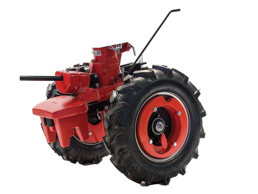Ťažná náprava je vybavená 12-palcovými fúkanými kolesami s traktorovým vzorom a uzávierkami, ktoré nahrádzajú funkciu diferenciálu. Vonkajšie a vnútorné závažia kolies zaisťujú stabilitu a lepšiu ovládateľnosť stroja.
