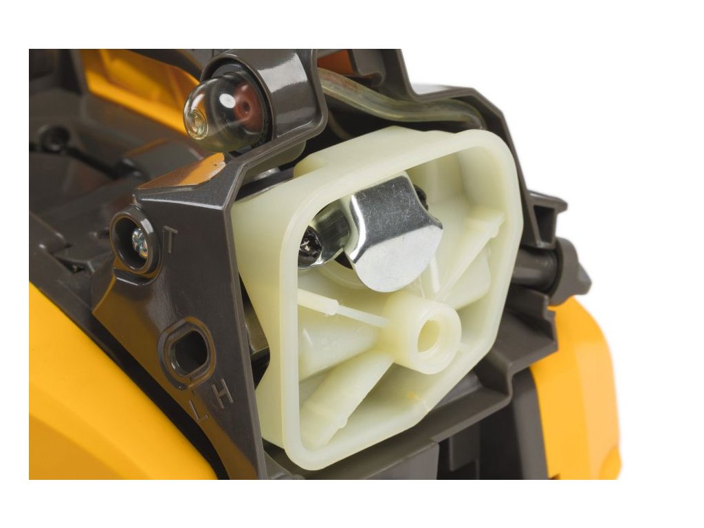 Vďaka automatickému olejovému čerpadlu a bočným napínacím skrutkám je údržba píly mimoriadne jednoduchá. Kompaktné rozmery 493x240x223 mm a špeciálny závesný hák zvyšujú praktickosť použitia.